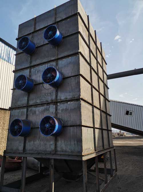 烘干后的熱蘭炭被送入蘭炭冷卻機種,然后冷風開啟對蘭炭進行均勻降溫,由于采用冷氣流的方式,降溫效率高,可在短時間內將蘭炭從一百多度降溫至40度,這個溫度屬于蘭炭的安全溫度,可以正常的儲存和裝袋,對生產不造成任何影響。
